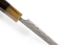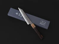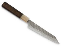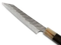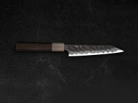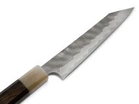 , der kleine Alleskönner, ist ein vielseitig einsetzbares Messer für die kleineren Arbeiten oder auch Schälarbeiten. Die Klinge hat einen Schneidkern aus Aogami super Stahl. Sehr markant ist das Hammering, individuell von Hand ausgeführt, so dass jedes Messer ein Unikat ist. Der Griff besteht aus hochwertigem