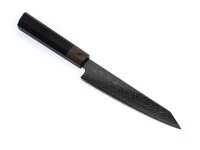 Messer von Yoshimi Kato vereint Schönheit und Funktionalität in einem Meisterstück. Der Griff aus italienischem Olivenholz, gewachst, achteckig geformt, liegt perfekt in der Hand. Sofort wird der Wunsch wach, die Damastklinge ihrem eigentlichen Zweck zuzuführen. Die ca. 170 mm lange Klinge, eine sehr gute Länge für das Allzweckmesser, wurde aus SG2 Stahl und vielen Schichten Damaststahl gefertigt. Der renommierte Stahlhersteller Takefu Special Steel bezeichnet den Stahl als Super Gold 2 (SPG2). Es ist ein pulvermetallurgischer, rostfreier Stahl mit einigen Besonderheiten. Messer-Schmiede und Messer-Liebhaber schätzen besonders die homogene, feine Struktur, den hohen Härtegrad von 63