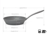 Die Solitto Gusseisenpfanne wurde als formvollendeter Standard für die anspruchsvolle Küche entwickelt. Besonderes Augenmerk wurde bei der Entwicklung auf die tiefen Seiten, mit dem idealen Winkel gelegt. Die Konstruktion der Pfanne sieht vor, die Seiten beim Garen mit weniger Temperatur bei Bedarf mitzuverwenden. Im Gegensatz zu herkömmlichen Pfannen nimmt die Temperatur stetig sanft ab, nachdem die Hitzequelle ausgeschalten wird. So wird die Zellstruktur der Lebensmittel geschont und der Geschmack Umami optimal eingeschlossen. Der Griff ist so ergonomisch geformt, dass sich die Pfanne wie eine Verlängerung des Arms in den Händen halten lässt. Er ist rutschfest, die Oberfläche aus reinem Gusseisen erinnert etwas an Leder. Für den Daumen gibt es eine kleine Mulde, so dass sich die Eisenpfanne trotz Ihres Gewichts problemlos tragen und waschen lässt. Die Gusspfanne wird nach höchsten Standards auf Basis einer über Generationen hinweg stetig verbesserten Technik hergestellt.