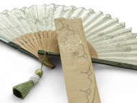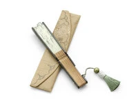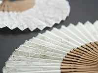 Für die Faltfächer der Serie Eien ist die Blume Utfugi das passende Motiv. Eien bedeutet so viel wie Ewigkeit und die zarten Blumen wurden so auf die japanische Baumwolle gestickt, dass sie auf ewig mit ihr verbunden sind. Die handgemalten Bilder waren mit den weichen Linien eine herausfordernde Vorlage. Die Textur gleicht einer antiken Spitze. Der klassische Fächer hat eine Steglänge von ca. 21 cm und ist offen ca. 38 cm breit. Ein Bild von einem Handfächer.