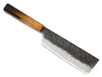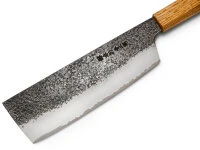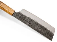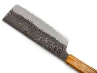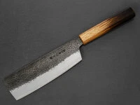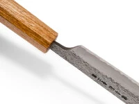 Geschmiedet wurden diese Messer von Itsuo Doi, einem der „Dento-Kogei-shi“-Preisträgern bei Aoki. Warikomi ist eine traditionelle Technik, bei der ein Eisenblock erhitzt und gespalten wird. In den Spalt wird der Schneidkern aus Kohlenstoffstahl – hier Aogami 2 – eingefügt und feuerverschweißt. Aus dem entstandenen Rohbarren schmiedet Itsuo Doi dann unter Hitze die jeweilige Klinge. Alle Messer der Serie Homura Guren haben ein Black Finish mit von Hand gehämmerter Oberfläche. Die hochwertigen Griffe sind aus geflammter Eiche, die mit