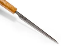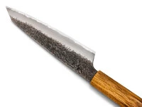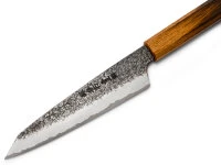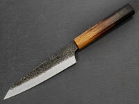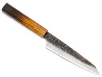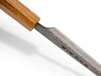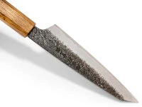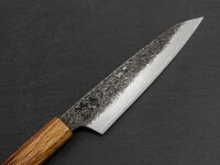 Geschmiedet wurden diese Messer von Itsuo Doi, einem der „Dento-Kogei-shi“-Preisträgern bei Aoki. Warikomi ist eine traditionelle Technik, bei der ein Eisenblock erhitzt und gespalten wird. In den Spalt wird der Schneidkern aus Kohlenstoffstahl – hier Aogami 2 – eingefügt und feuerverschweißt. Aus dem entstandenen Rohbarren schmiedet Itsuo Doi dann unter Hitze die jeweilige Klinge. Alle Messer der Serie Homura Guren haben ein Black Finish mit von Hand gehämmerter Oberfläche. Die hochwertigen Griffe sind aus geflammter Eiche, die mit