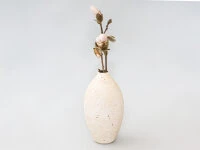 Die Oberfläche ist mit einer weißen Glasur überzogen, die so bearbeitet wurde, dass es wirkt, als sei die Vase mit Rissen übersät. Letzlich als Fingerzeig auf das ursprüngliche Material, aus dem das Werk erstellt wurde.